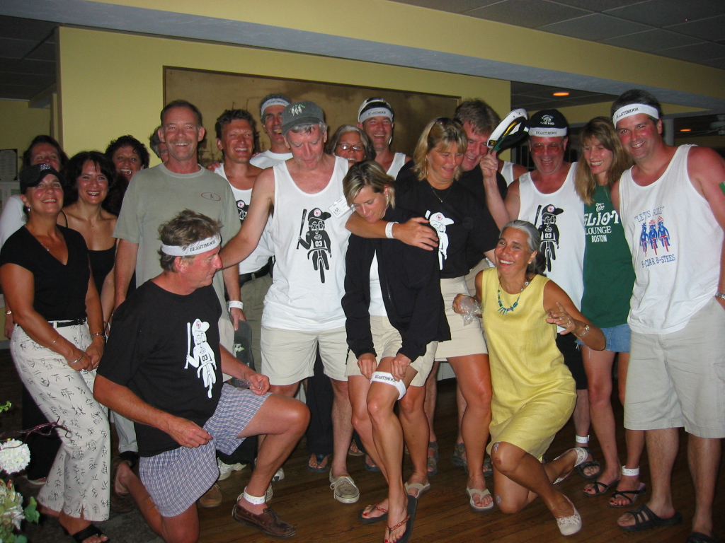 This year we added ex Boston Bruin Terry O'reilly to our group. We were also graced with some special guests thanks to Dr. Lee Nadler of the Dana Farber. Lee and I had spoken before the event. He was instrumental in getting Larry Lucchino, president of the Boston Red Sox, to approve use of their logo in our team logo. Lee's only request was that he get a B-Stee shirt. We got him his shirt and also provided some for Larry and Stacy Lucchino. Our surprise was when they all showed up at dinner in B-Czar B-Stee t-shirts. This was a proud moment for our team. They were really good sports and took some time to pose for some pictures with the group. I'm still waiting for copies of these pictures and will post them as soon as I get them.