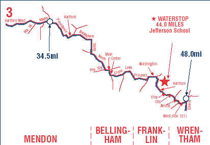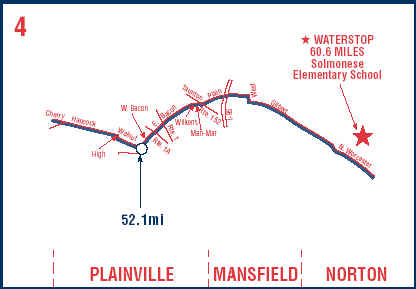 Quick refill of the water bottles and we were on our way towards water stop number 2 in Franklin. The miles from the first to the second stop are very hilly. You hit a wall only a couple miles from the stop. This is the climb up to Purgatory Chasm. As its name implies, it's hell but again, at least it's still in the first 40 miles as opposed to the last 40. We covered the second leg in a very short time and were in Franklin before we knew it. This was my favorite stop as I got to see Nancy, Eric, and Nicole all working as official PMC volunteers. They all seemed to be enjoying themselves in spite of the weateher. This was the first time in the 15 years that I've been riding the PMC that it was a complete family event. This meant a lot to me. Dana Farber has been very good to us this year and I think this helped the rest of the family make the connection to the PMC.