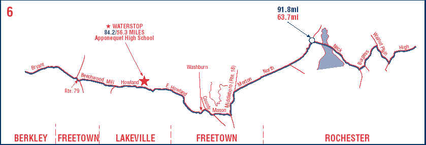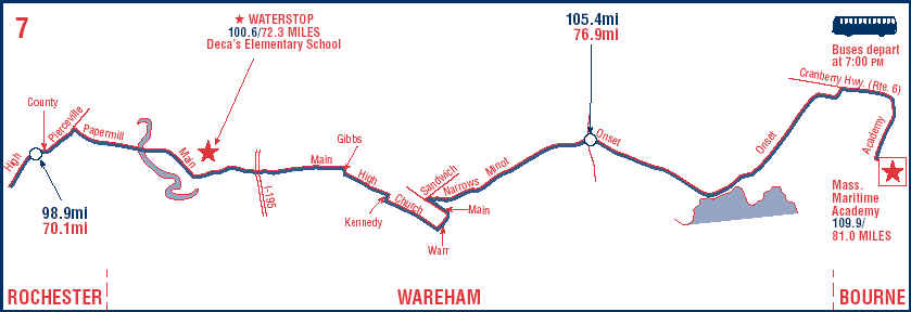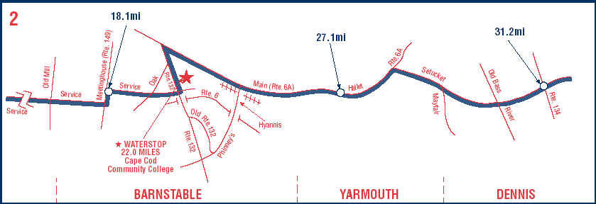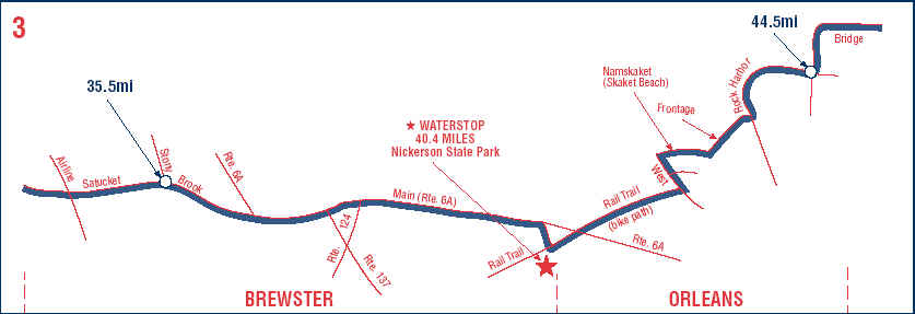 Back to the dorm and asleep by 9. Amazing how easy it is to fall asleep after a day of riding, a great meal, some wine and a martini :-) 4:00am rolled around before we knew it and we were up, dressed and down to breakfast for the final day's ride. It was overcast but it was not raining so we were very happy. Our crew started out together riding over the Bourne bridge and then along the Cape Cod Canal for about 5 miles before getting to the access road that parallels route 6. Once on the access road our group went down to 3 riders, me, Wayne and Eric. We covered the first 20 plus miles in about an hour. This took us to the Cape Cod Community College water stop, the first of three for the day. We hit the water, some food, porta potties, and off to water stop 2 at Nickerson state park. This is the fastest 20 plus miles of the day. We covered this in under an hour riding in pacelines the entire way.