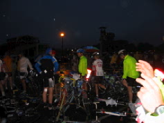 Opening ceremonies ended at 9 and it was off to bed. There was a 4am wakeup call coming before long. Well, sleep did not come easy. In fact, I lay there tossing and turning until about 1am when I finally fell off. ring... wakeup time. Ugh... I felt exhausted and was wondering how I was going to cover 112+ miles on barely 3 hours sleep. Then came the sound of the pouring rain. Wonderful, here we go. So much for that nice clean bike.