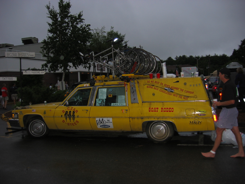 The afternoon wouldn't be the same if Mr. Forbes, our team car, didn't show up with at least one story. This year it caught fire on the way to Sturbridge but the guys put it out with water from their water bottles, no kidding. Well it arrived safely in Sturbridge and was the center of our afternoon activities as usual. Beer was flowing from the tap on the side and tattoos were being applied to all that wanted them. We have people back every year that really look forward to this. It never ceases to amaze us but as long as people enjoy it we'll keep bring the car, although it might be time to buy a new one...