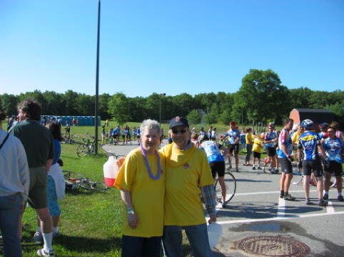 The ride started at 6am. It was an absolutely gorgeous day which was quite a nice change from the downpour the year before. The first 40 miles passed by in a flash. These are the toughest miles as they are very hilly. To my surprise we were averaging over 21 mph which is very fast for me. Nancy, Nicole, and my cousins Len and Elaine were working at the 40 mile water stop in Franklin. That was really nice to see. I've said this in years past and I can't emphasize it enough but the volunteers are what help to make this ride so easy for us riders. They are always surprised at the "thank yous" that all the riders give them. It's funny and an interesting perspective hearing it as a rider from the volunteers. We couldn't do what we do without them. The fact that there's all this food, drinks, medical staff, etc there for us is so incredible. Anyone that has done a "regular long distance ride" knows what a different experience the PMC is compared to that. We have so much support that it's hard not to ride well. Ok, the training is important and I could not do the ride without being properly trained. I also could not do it as well as I do without the support of these volunteers. Having family out there working the event makes it even more special and personal to me.