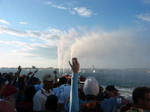 The riding was done and it was time to relax and enjoy. Warm showers were waiting for us and once we were cleaned up we put our luggage and bikes on trucks and it was time to eat, drink and relax. This is a common theme for the weekend. The difference with Sunday is we didn't have to be to concerned with getting up and riding again on Monday :-) It was a great day in P-Town. We left the Inn and headed into town for a stop at our usual watering hole, the Governor Bradford, for a pop with friends before boarding the Ferry for the party back to Boston. P-Town is always an interesting experience. After a couple drinks, it's time to board the Ferry. The band was on the top deck tuning up and ready to play for the ride back. The same band we've had for years, the "12 Oh One Blues Band", was there and ready to rock. As usual, there you have the 1000 plus cyclists that opt for the party boat back. You'd think ths crew would be tired but they're up there dancing and partying all the way back to Boston for the 3 hour tour... We arrive in Boston around 7 PM to the Boston Fire Boat Greeting and the crowds of cheering family members. It's a little sad as this is the end of our weekend. For most of us we won't see each other till the following year. We say our goodbyes, head off to our rides, and another ride has come to an end.